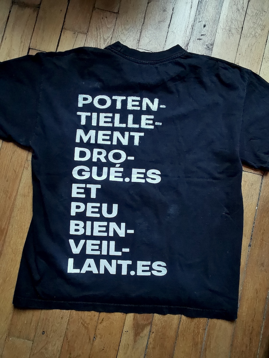 Short-sleeve t-shirt 100% cotton (more or less) Hand-screen printed on vintage item Size, cut and design are not conventional Machine wash inside out at max 30°C It's 100% DIY!